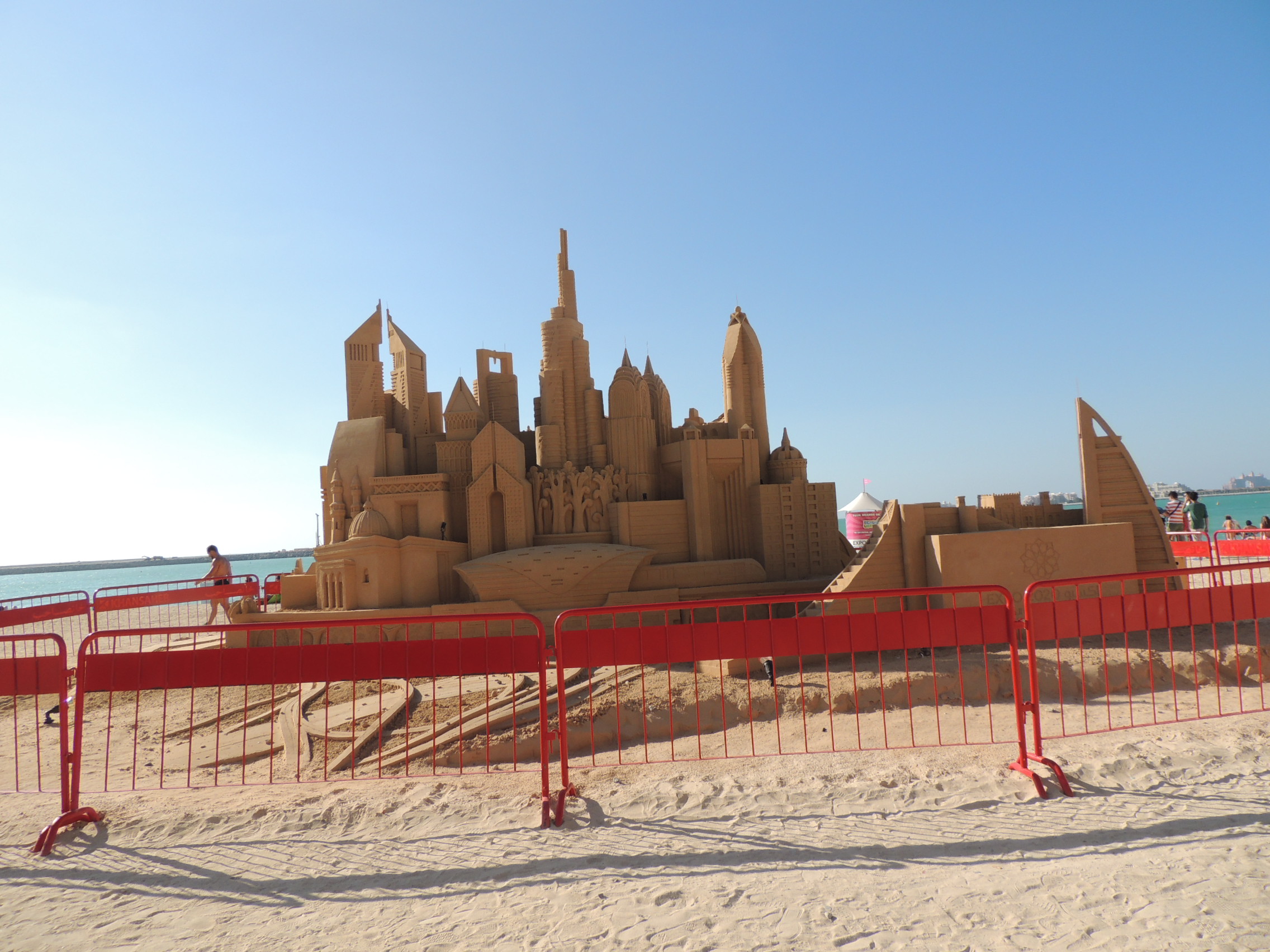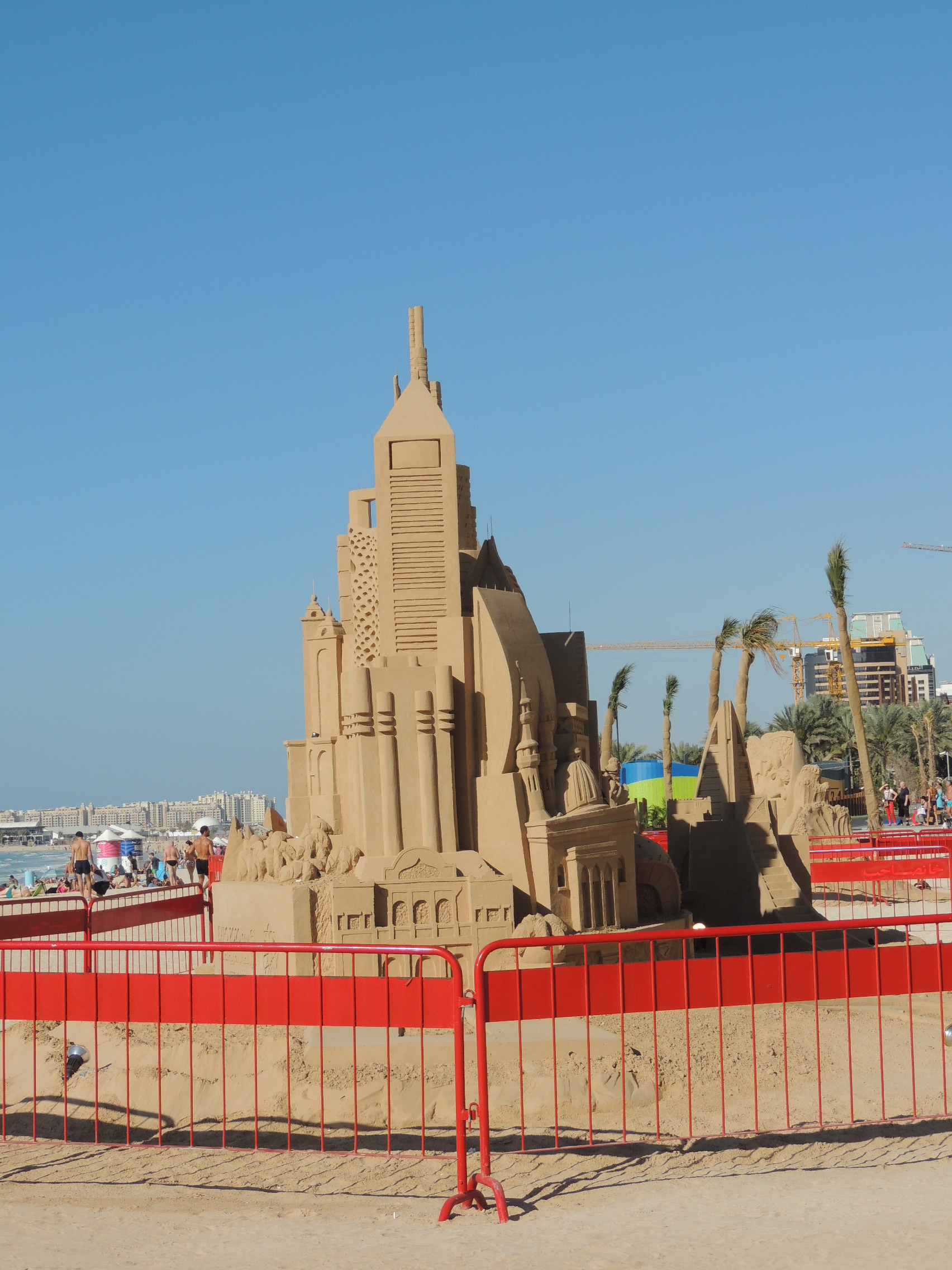 My obsession for Zataar W Zeit finally got the best of me when I was in Dubai and after much, much persuasion Nayef agreed that we could go there. The closest one to us was located at the Jumeirah Walk so we headed there. After stuffing our faces with zataar and cheese, we decided to go for a stroll along the beach, and stumbled upon these cute sand castles, er, uh, sand sculptures? Sand sculptures. We stumbled across some lovely sand sculptures. My favorite one is the sand Dubai. Which is yours?
