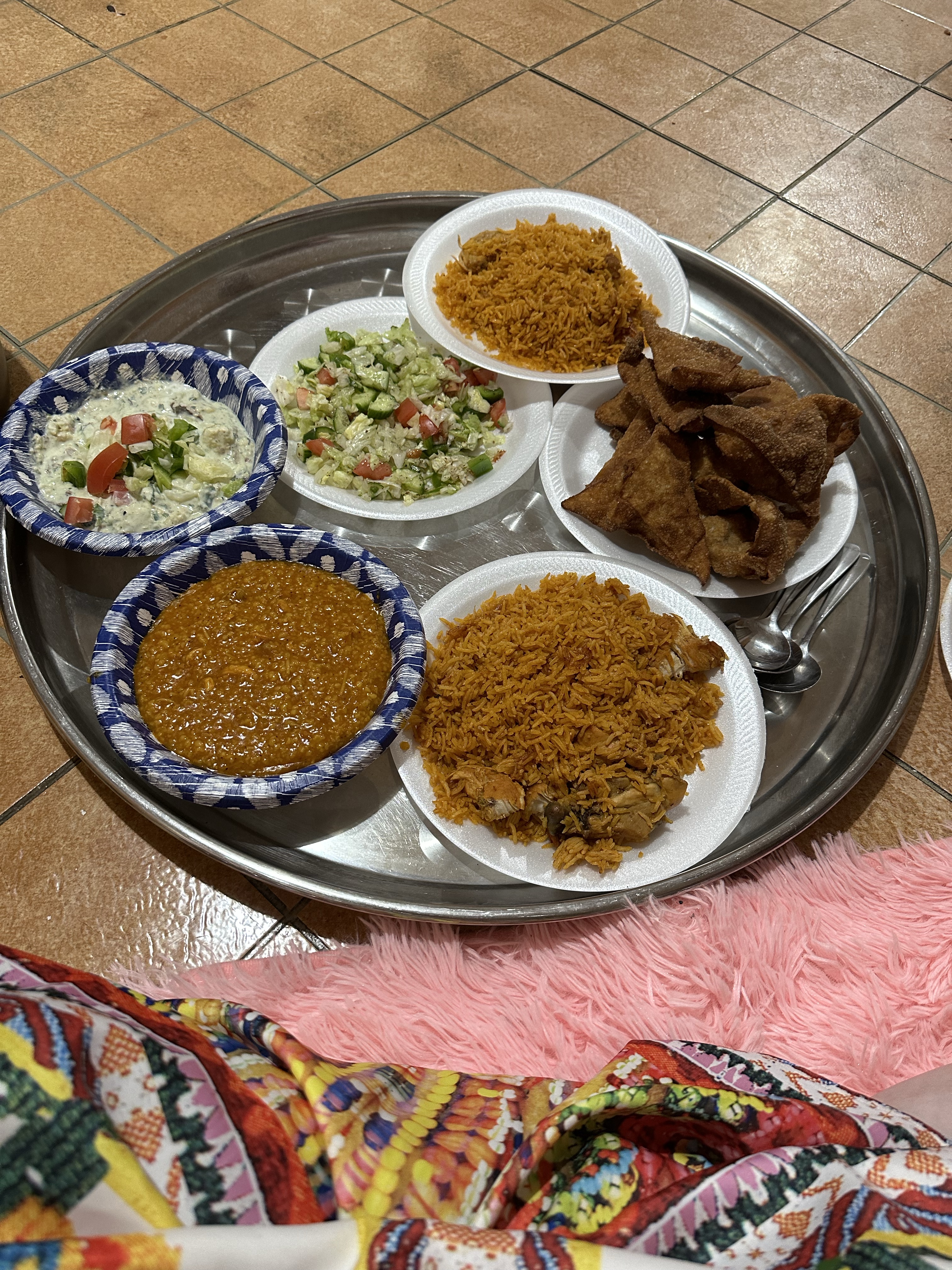 Some of the food I had eaten before. Other food I had never tried, but dear reader, I am not picky. I will eat it all. Another fun thing about Khaleeji culture you may or may not know is most times no table is used during dinner. We just sit on the floor and eat. Sometimes we don’t even use individual plates- we all eat from one big platter. And for those that want to be super traditional, they may even forego utensils. The hardcore ones just eat with their hands.